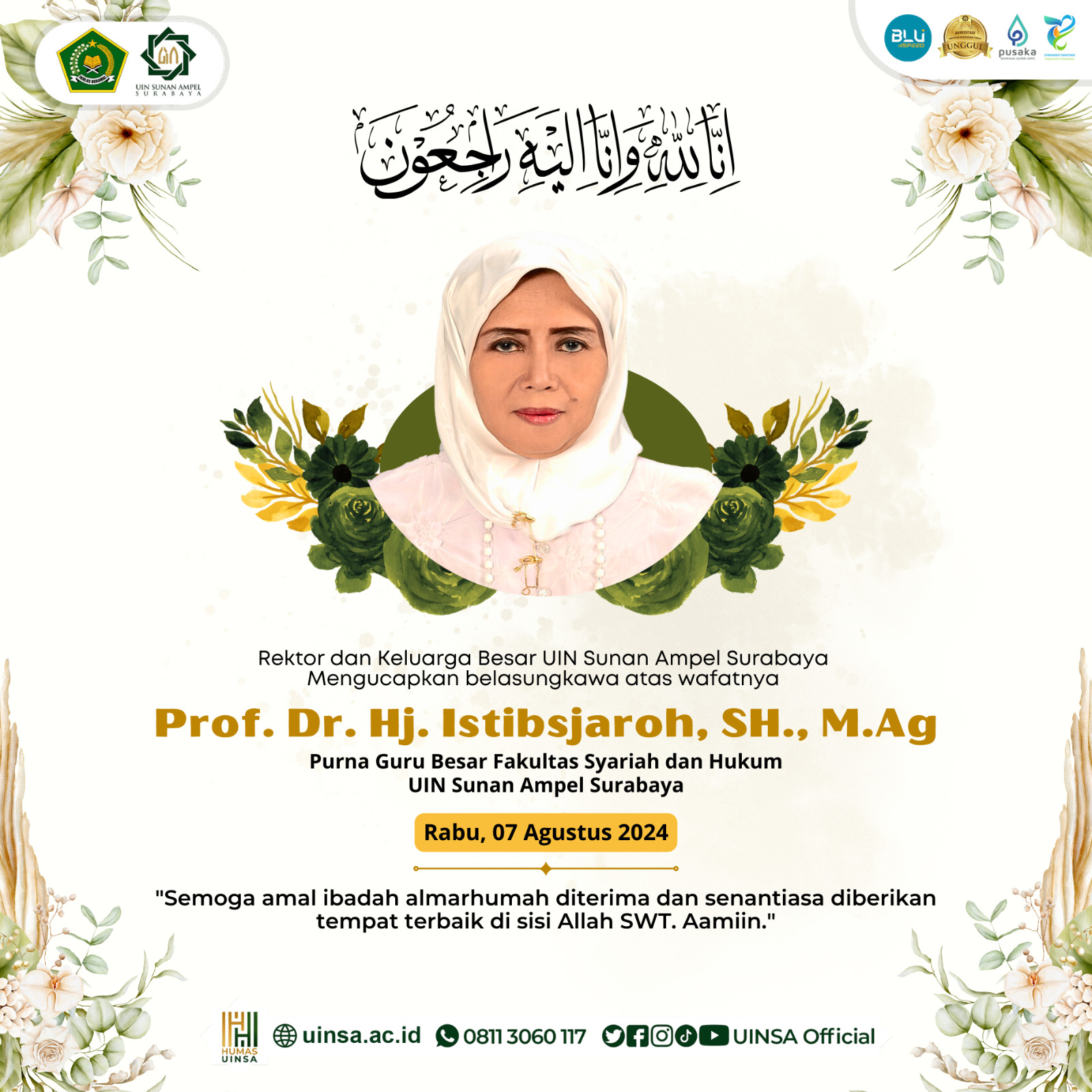 Sebagai manusia tentu tidak akan mampu melawan ajal. Bu Is akhirnya harus menghembuskan nafas terakhirnya pada 07 Agustus 2024. Kita semua yakin bahwa Bu Is adalah orang Islam yang sangat istimewa, baik dalam pandangan masyarakat, sesama koleganya dan juga di hadapan Allah SWT. Selamat jalan Bu Is, panjenengan kami yakini sebagai bagian dari ahli surga. Amin. Laha Al fatihah..