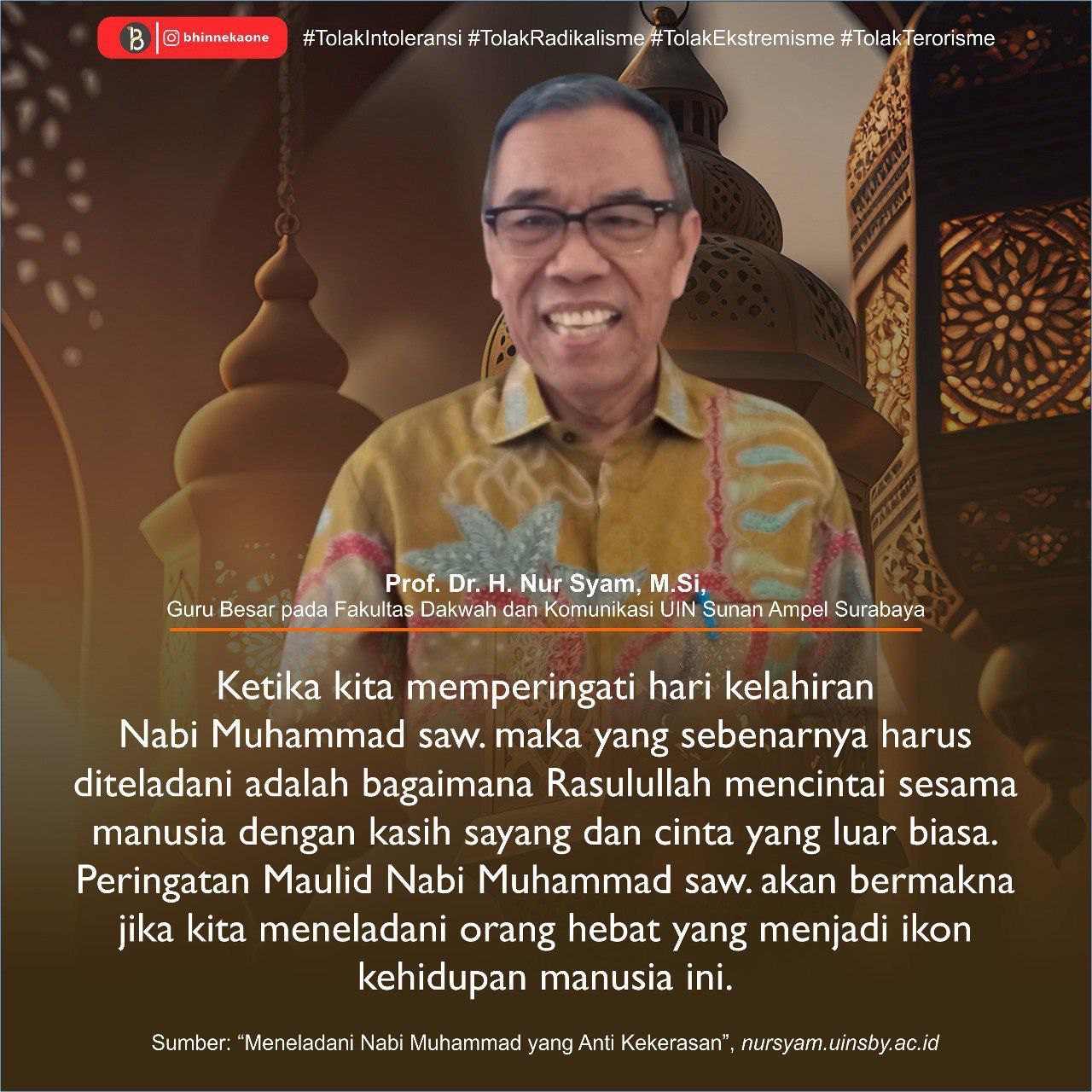 Nabi Muhammad SAW merupakan contoh yang paling lengkap. Jika saya menulis ini bukan berarti para Nabi sebelumnya bukan contoh yang lengkap. Semua Nabi pasti memiliki keteladanan yang lengkap. Namun demikian, sebagai Nabi akhir zaman atau Nabi yang diturunkan Allah sebagai Nabi terakhir, maka tentu Nabi Muhammad SAW merupakan teladan yang lengkap atau uswah kamilah. Ada tiga makna keteladanan Nabi Muhammad, yaitu: pertama, keteladanan dalam mengajarkan agama yang wasathiyah. Islam yang disebarkan oleh Nabi Muhammad SAW adalah agama yang merahmati seluruh alam. Tidak hanya memberi rahmat kepada umat Islam saja tetapi kepada seluruh alam. Seluruh manusia dan alam semesta. Nabi tidak pernah mengajarkan kekerasan. Jika Nabi Muhammad melakukan perang, maka hal itu dilakukan karena terjadinya pengingkaran atas perjanjian kerja sama, dan juga karena umat Islam akan diserang oleh kelompok lain. Seluruh perang yang dilakukannya berbasis atas dua hal dimaksud.